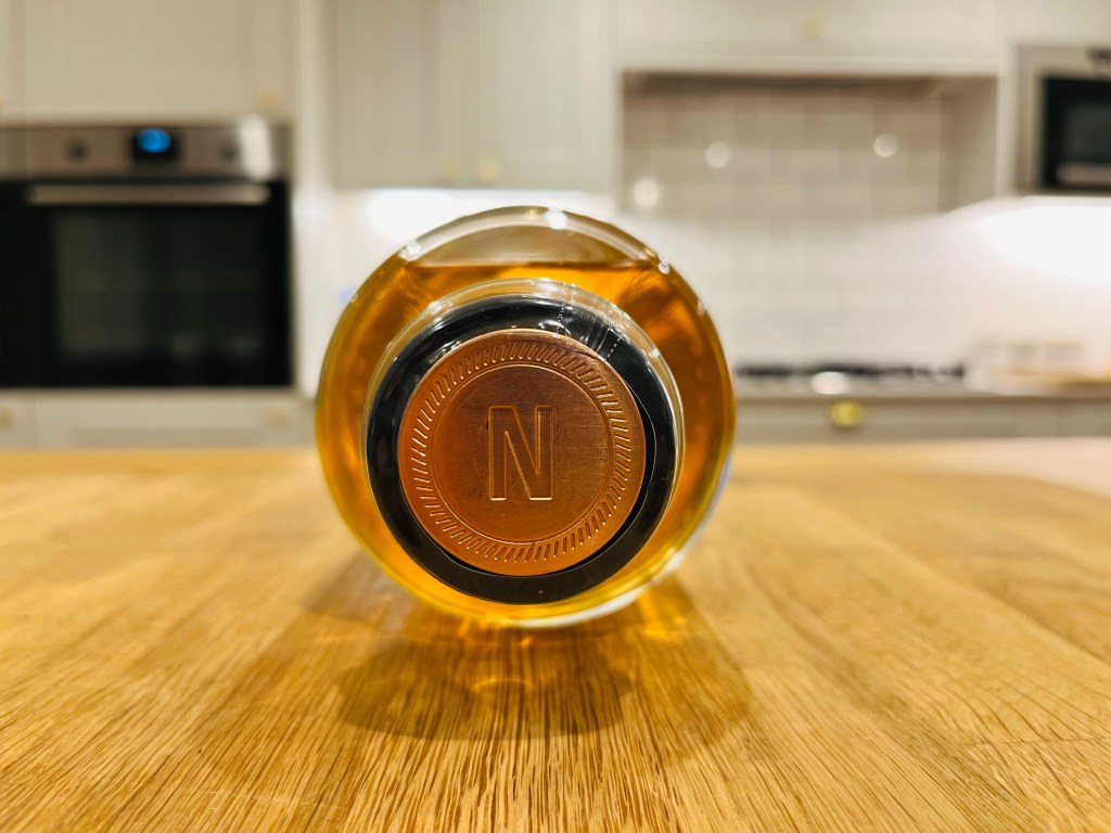 And speaking of the stopper, it is the piece de resistance. The heavy set, polished wood topped, cork houses an embossed metal disk that denotes the ‘N’ of the Nouaison name; the rose gold of the Reserve is particularly striking.